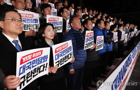 더불어민주당 박찬대 원내대표를 비롯한 의원들이 7일 오후 국회 본청 앞에서 계단에서 '거짓말투성이 대국민담화 긴급 규탄대회'를 열고 있다.