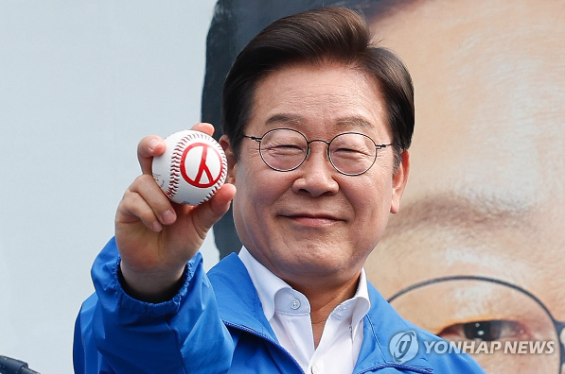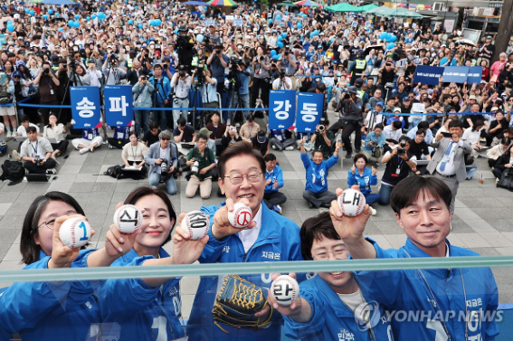 | ▲ 서울 송파구 잠실종합운동장 광장에서 열린 강동구·송파구 집중 유세에서 기표 모양이 그려진 야구공을 들고 있는 더불어민주당 이재명 대선 후보. 2025.5.29 (사진=연합뉴스) |