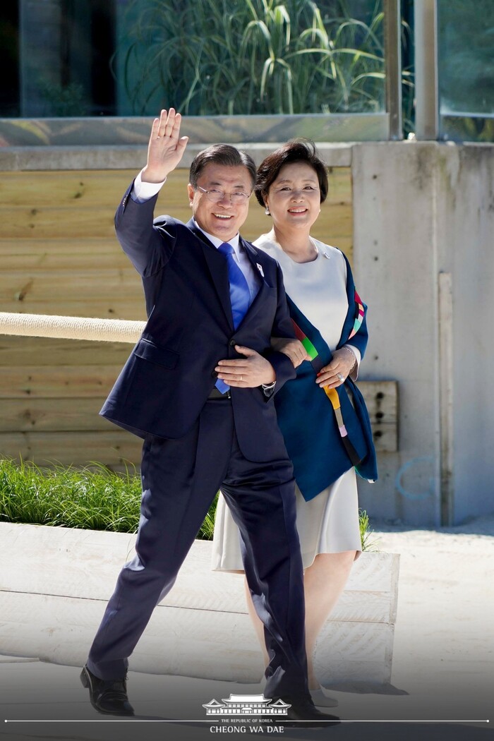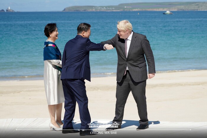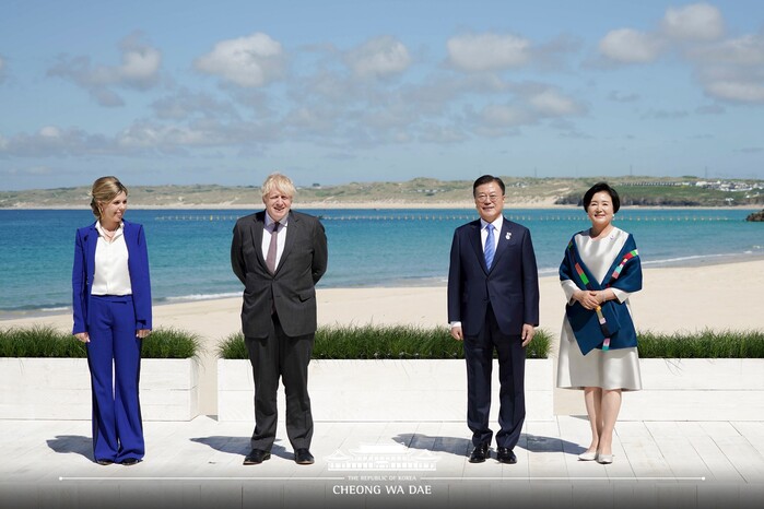 문재인 대통령과 김정숙 여사가 G7 정상회의 초청국 공식 환영식에 참석했다. 문 대통령 부부는 12일(현지시각) 오후 영국 콘월의 카비스 베이에서 열린 G7 초청국 공식 환영식에 참석해 보리스 존슨 영국 총리와 부인 캐리 존슨 여사의 환영을 받았다.