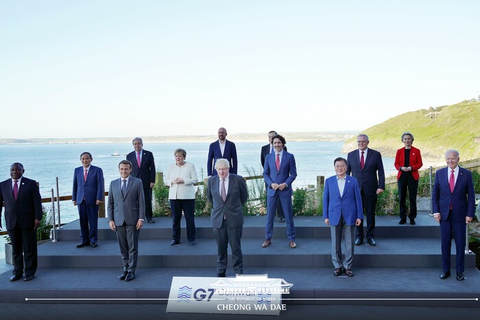 6월 12일 저녁(현지시각) 문재인 대통령은 에어쇼 관란에 앞서, 카비스 베이 호텔 야외에서 G7에 참석한 정상들과 단체 사진 촬영을 했다. 코로나19 조기 극복을 위한 보건, 경제 등 글로벌 협력 방안을 논의하기 위해 영국에 모인 11개국 정상들의 모습을 사진으로 전했다.