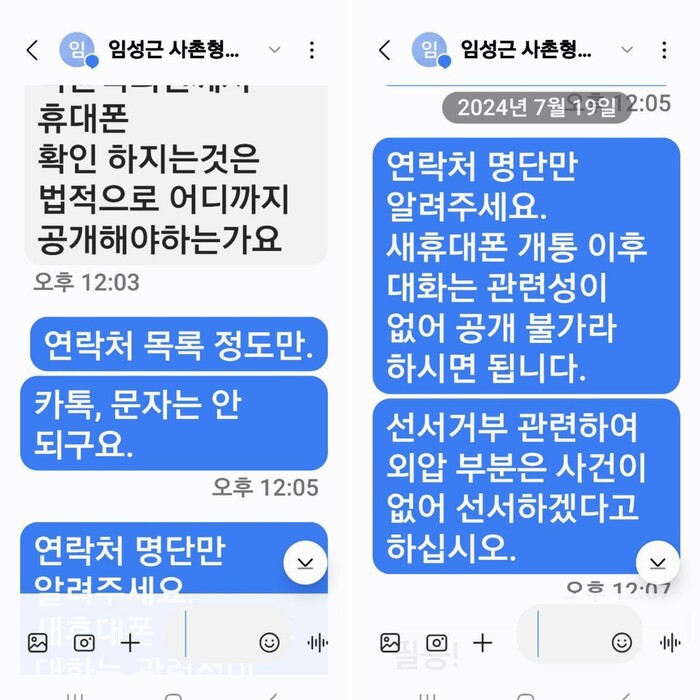 박 검사는 임 전 사단장과 주고받은 문자메시지 내용을 공개하고 "연락처 목록 정도만. 카톡, 문자는 안 되구요. 연락처 명단만 알려주세요. 새 휴대폰 개통 이후 대화는 관련성이 없어 공개 불가라 하시면 됩니다"고 답했다고 밝혔다.