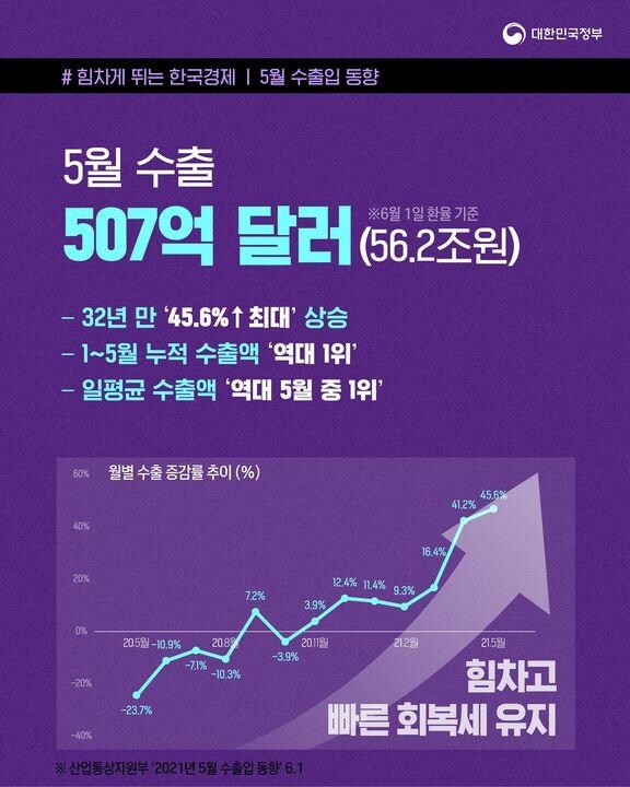 지난달 우리나라 수출이 1년 전보다 45.6% 증가하며 32년 만에 최대 폭으로 상승하고 7개월 연속 증가한 것으로 나타났다. 수출액은 역대 5월 중 1위이고, 2개월 연속 40%대 성장은 역사상 처음이다. 일 평균 수출액은 2018년 이후 처음으로 24억 달러를 넘어선 가운데 이는 역대 5월 중 1위이자 역대 모든 달과 비교해도 3위에 해당한다.
