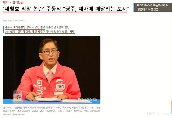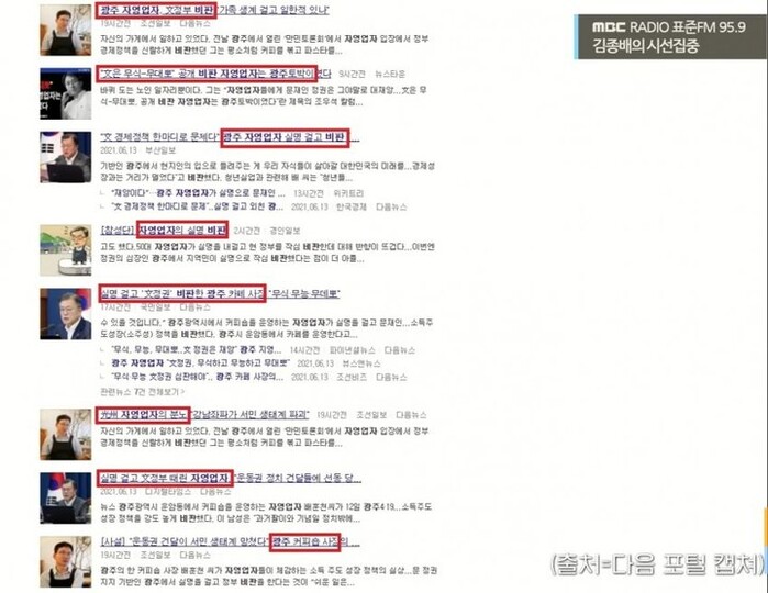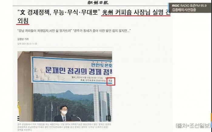 그런데 어제 이런 ”보수 야권의 소망에 딱 맞춤형인 기사“가 포털과 인터넷에서 굉장히 크게 화제가 돼서 가져와 봤다"라며 광주의 ”카페 사장님이 실명을 걸고 문재인 정부의 경제정책을 비판했다는 기사로, 문재인 정부와 민주당의 핵심 지지층인 호남에서 서민층의 비판 목소리가 커지고 있다고 강조한다. 조선일보에 이어 다른 매체들도 이런 프레임으로 기사를 쏟아냈다. 한마디로 호남지역 민심 이반 분위기를 만들고 싶었던 것 같다"라고 설명했다.