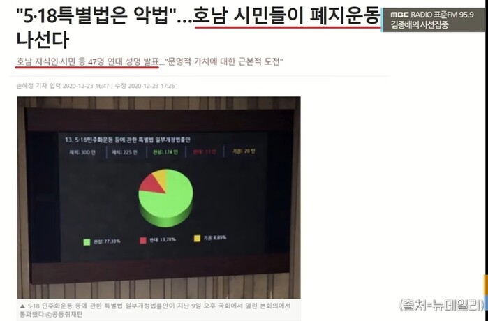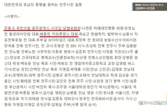 그러면서 이 당시 구성요인들이 문제인데, 47명 중에서 주도했던 인물이 주동식 호남 대안 포럼 광주 서구위원장이란 사람인데, 그는 국민의 힘 광주 서구갑 당협위원장으로 정치인이다. 조선일보에서 자영업자로 보도한 “까페 사장 배 씨도 이 서명운동”에 나란히 이름을 올렸던 사람이라고 말했다.