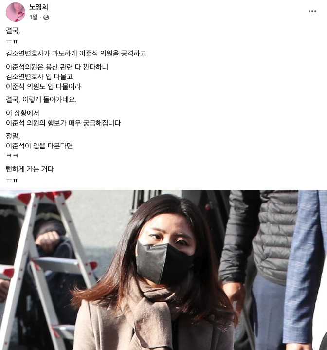 | ▲ 강혜경 씨의 법률대리인 노영희 변호사의 게시글 (출처=노영희 페이스북) |