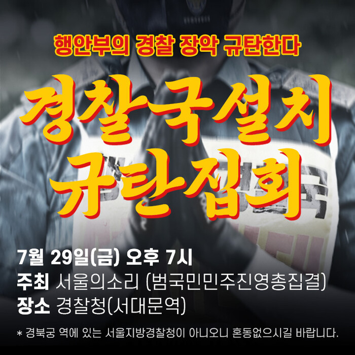 이어 29일 경찰청 앞에서는 오후 7시부터 범시민연대의 경찰국 반대를 위한 대규모집회를 예고했다.
