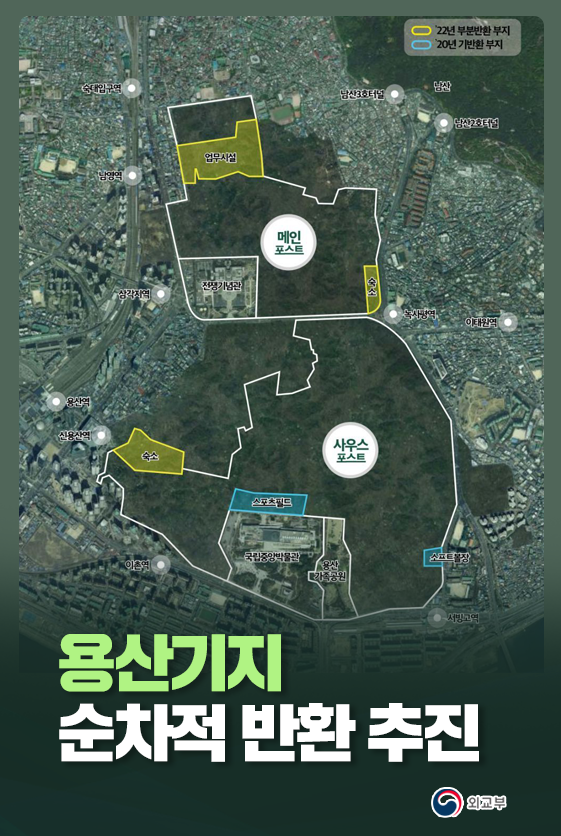 정부는 오늘(2.25,금) 오후, 한미 주한미군지위협정(SOFA) 합동위원장간 협의를 통해 용산기지 일부와 의정부 캠프 레드클라우드 등 미군기지 반환에 합의하였다.