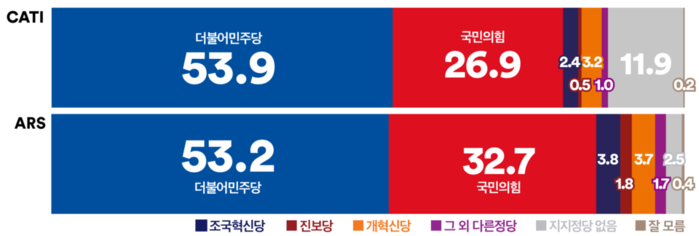 정당 지지율에서는 더불어민주당이 과반을 넘는 지지율로 선두를 유지했으며, 국민의힘은 상대적으로 낮은 수치를 기록했다.
