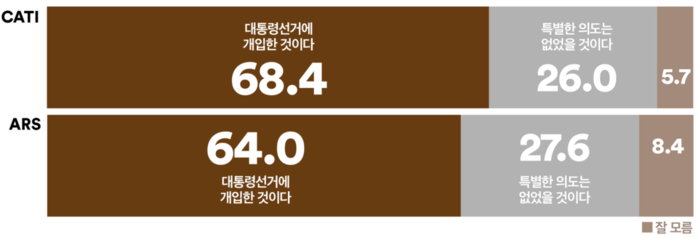 특히, 대법원이 이 사건을 유독 35일 미만으로 선고한 것을 두고 ‘대선 개입이다’라는 의견은 ARS 64%, 전화면접 68.4%로, 전국 대부분의 연령과 지역에서 과반을 기록했다.