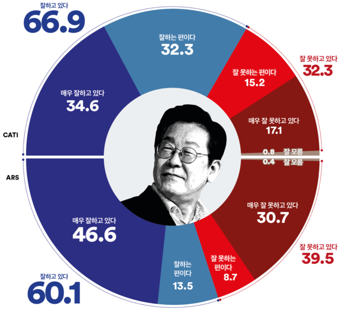 이재명 대통령 직무 수행 평가에서 ARS 조사 기준 긍정 평가는 60.1%, 부정 평가는 39.5%였으며, 전화면접 조사에서는 긍정 66.9%, 부정 32.3%를 기록했다. 전 세대에서 긍정 평가가 과반을 넘었고, 특히 40~50대에서는 70% 이상으로 나타났다.