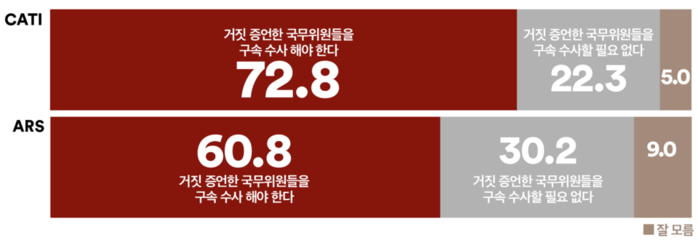 12월 3일 계엄 당일 대통령실 CCTV 공개 이후, 한덕수·최상목·박성재 등 국무위원의 거짓 증언에 대해 국민 10명 중 6~7명이 구속 수사를 지지하는 것으로 나타났다.
