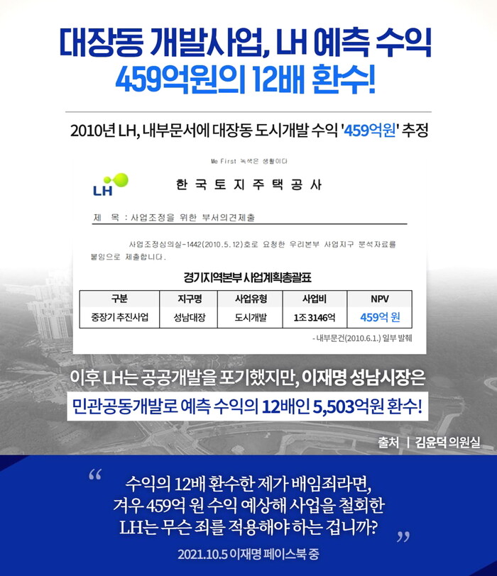 김윤덕 의원님이 공개한 자료에 따르면 2010년 LH가 예측한 대장동 사업의 수익은 459억 원입니다. LH가 예측한 수익의 12배를 환수한 제가 배임죄라면, 겨우 459억 원 수익을 예상해 사업을 철회하여 회사에 막대한 손해를 끼친 LH 관계자들에게는 무슨 죄를 적용해야 하는 겁니까?