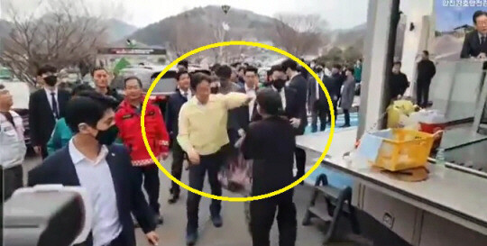 | ▲ 27일 경북 산불 현장을 찾은 이재명 더불어민주당 대표가 행인에게 습격 당하는 장면. (제공=민주당) |