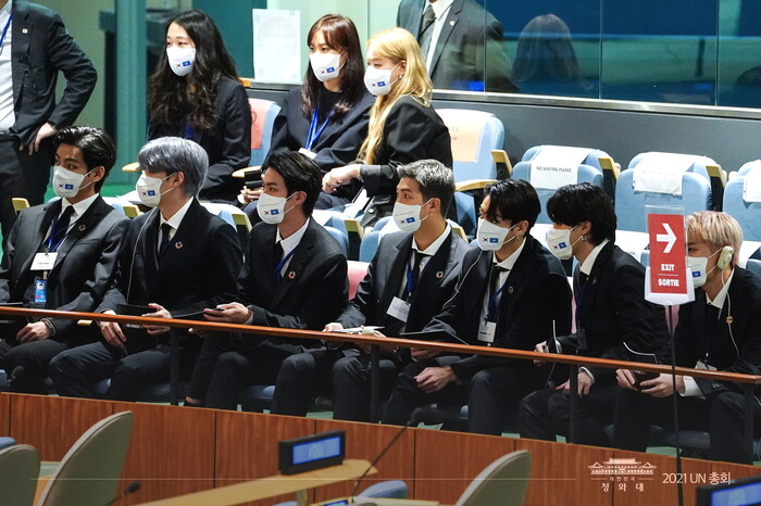 문 대통령은 함께 개회 세션에 참석한 BTS를 소개하며 "오늘 이 자리에는 전 세계 청년들과 교감하고 있는 탁월한 청년들, BTS가 ‘미래세대와 문화를 위한 대통령 특별사절’로 함께하고 있다"며 "오늘의 자리가 지속가능발전을 향한 미래세대의 선한 의지와 행동을 결집하는 계기가 되기를 바란다"고 당부했다.
