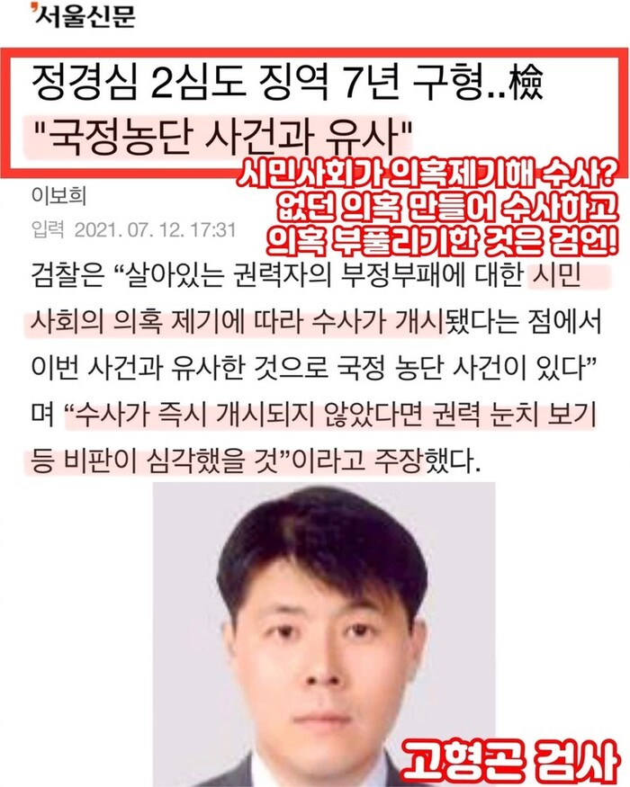 검찰이 대법원에서 정 교수의 무죄가 확정된 조범동 씨 관련 사모펀드 부분을 무시하고 '국정농단'이라는 용어까지 구사하며 1심대로 7년을 그대로 적용하면서 비판이 이어지고 있다.