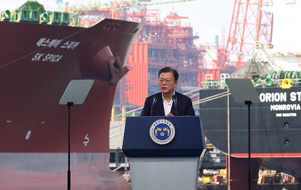 | ▲문재인 대통령이 9일 경남 거제시 삼성중공업에서 열린 K-조선 비전 및 상생 협력 선포식에서 발언하고 있다. (연합뉴스) |