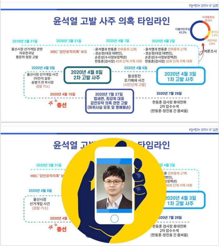 2020년 3월 검언유착 보도 후 이틀 동안 윤석열과 한동훈은 30여 차례 전화를 하고, 권순정(대검 대변인), 손준성(대검 수사정보정책관), 한동훈 검사장은 75회 단체 카톡을 합니다. 이후 4월 3일 1차 고발 사주가 있었고, 4월 8일 2차 고발 사주가 있었습니다.