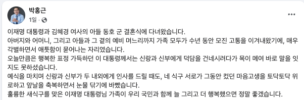 박홍근 의원은 페이스북 계정에 “행복한 표정 가득하던 이 대통령께서 신랑과 신부에게 덕담을 건네시려다 목이 메어 바로 말을 잇지도 못하셨다”면서 “예식을 마치며 신랑과 신부가 두 내외에게 인사를 드릴 때도 네 식구 서로가 그동안의 마음고생을 위로하고 앞날을 축복하며 눈물 닦기에 바빴다”고 결혼식 분위기를 설명했다.