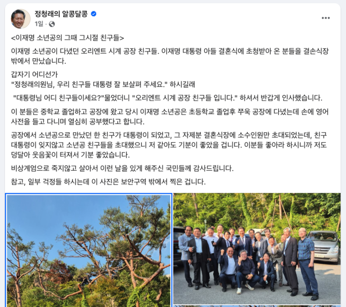 | ▲ 이재명 대통령의 소년공 시절 함께 일했던 오리엔트 시계 공장 친구들과 정청래 더불어민주당 의원이 이 대통령 장남 동호씨 결혼식 후 기념사진을 촬영했다 (출처=정청래 페이스북) |