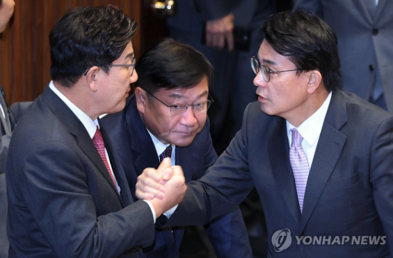 | ▲ 2025.1.8 국회 본회의장에서 손을 맞잡은 국민의힘 권성동 원내대표와 윤상현 의원 (사진=연합뉴스) |