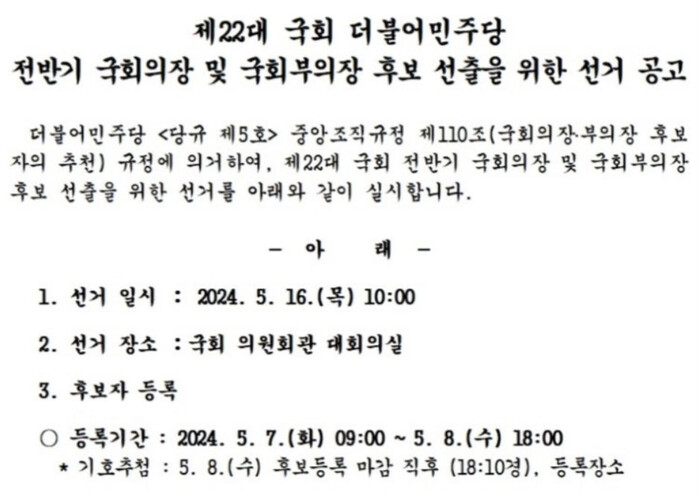 더불어민주당이 제22대 국회 전반기 국회의장 및 국회부의장 후보 선출을 위한 선거 공고를 공개했다.