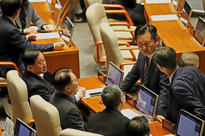 ▲ 더불어민주당 의원들이 19일 서울 여의도 국회 본회의장에서 공소청법 처리를 둘러싸고 의견을 나누고 있다. 2026.3.19 (사진=시사타파뉴스)