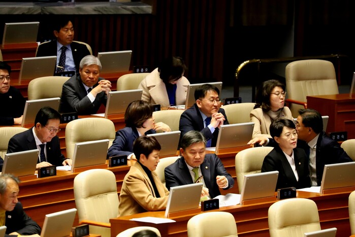 ▲ 더불어민주당 의원들이 19일 서울 여의도 국회 본회의장에서 공소청법 처리를 앞두고 대화를 나누고 있다. 2026.3.19 (사진=시사타파뉴스)