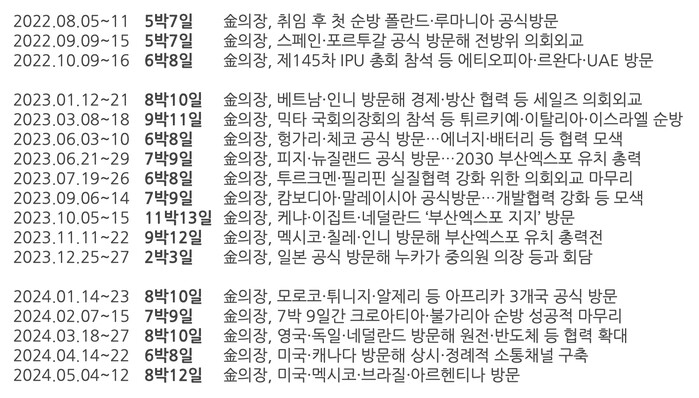 시사타파뉴스는 국회의장 소식을 전하는 국회뉴스On의 해외 순방 기사를 정리 분석한 결과 취임 후 한달만인 2022년 8월 5일 5박 7일간의 폴란드, 루마니아 공식 방문을 시작으로 2022년 3회, 2023년 9회, 올해는 4차례의 해외순방을 다녀왔다.