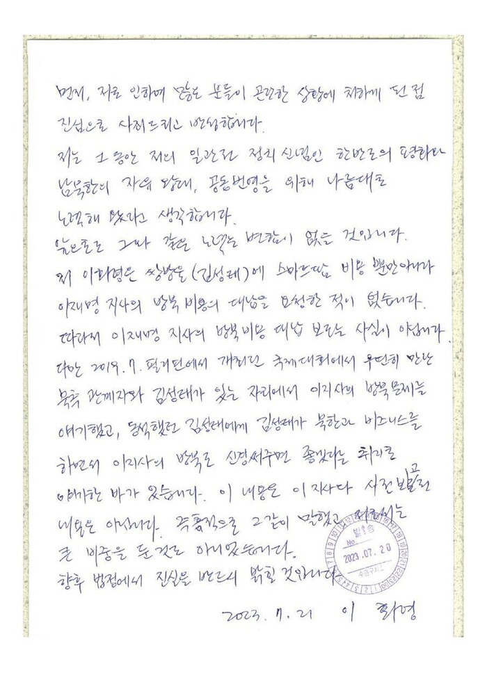 검찰에서 기존 입장을 일부 번복했다고 알려진 이화영 전 경기도 평화부지사가 "쌍방울에 방북 비용 대납을 요청했다는 보도는 사실이 아니다"라며 옥중 자필 입장문으로 반박했다.