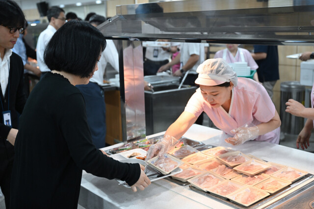 | ▲ 용산 대통령실 청사에서 우리 수산물 메뉴로 구성된 점심 식사를 배식받고 있다. (사진=연합뉴스) |