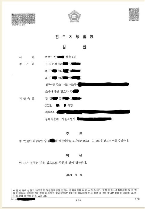 A씨는 상속포기 결정문도 같이 공개했다. 시누이 김씨는 회사를 김 위원장이 가로챘다고 주장했지만 아들 A씨는 이 역시 사실이 아니라고 언급했다.