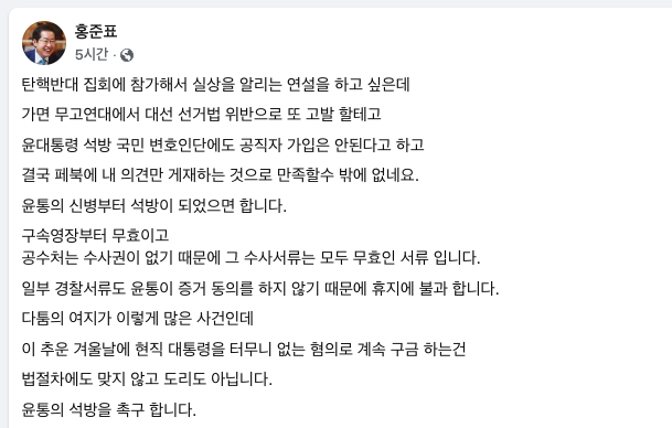 홍 시장은 “윤 대통령 석방 국민 변호인단에도 공직자 가입은 안 된다고 하고, 결국 페이스북에 내 의견만 게재하는 것으로 만족할수 밖에 없다”며 “윤 대통령 신병부터 석방됐으면 한다. 구속영장부터 무효이고, 공수처는 수사권이 없기 때문에 그 수사 서류도 모두 무효”라고 주장했다.