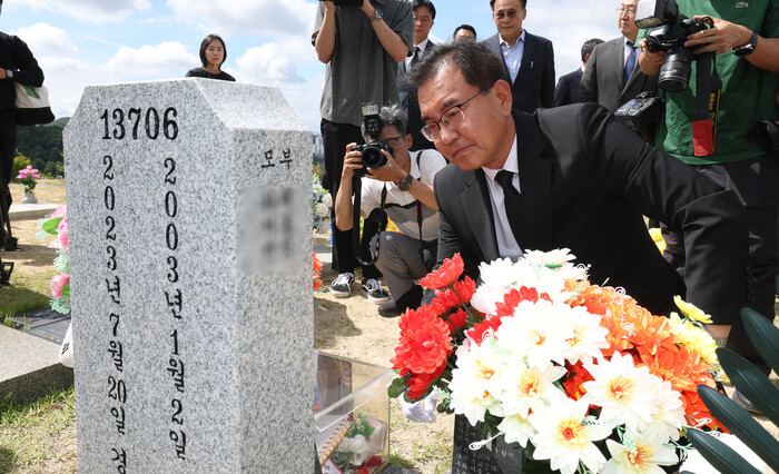 | ▲ 이명현 순직해병대원 특별검사가 1일 대전 유성구 대전현충원에서 고 채수근 상병 묘소를 바라보고 있다. 2025.7.1 (사진=연합뉴스) |