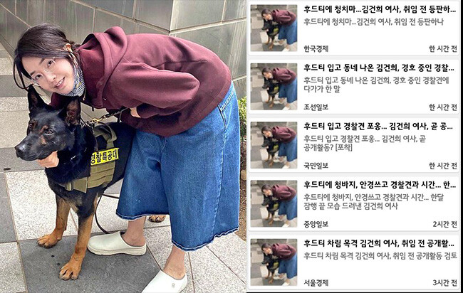 | ▲ 최근 김정숙 여사의 2만원대 브로치를 2억원대라고 허위보도한 기사들이 쏟아져 나온 후 등장한 김건희 후드티 사진(좌측사진)과 기사들 헤드라인(우측사진) |