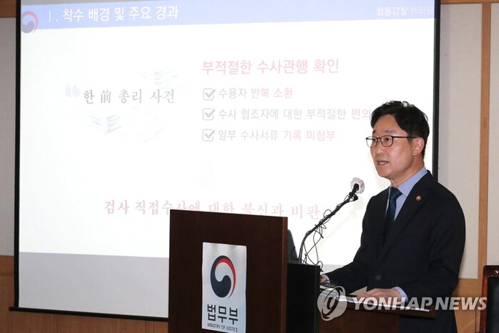 박범계 법무부장관이 14일 한명숙 전 총리 모해위증 교사 의혹 사건에 대한 법무부와 대검의 합동감찰 결과를 직접 발표했다.