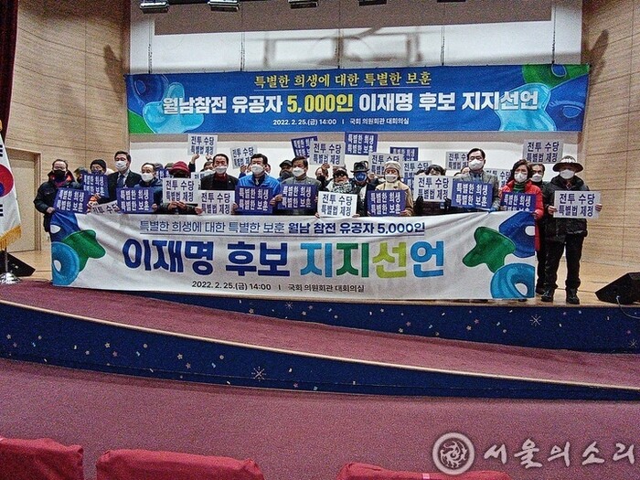 "5000명의 월남참전 유공자 단체를 대표하는 단체회원 90여 명" 은 25일 오후 국회 의원회관 대회의실에서 "이재명 후보지지를 선언하며 지지선언문" 을 발표했다.