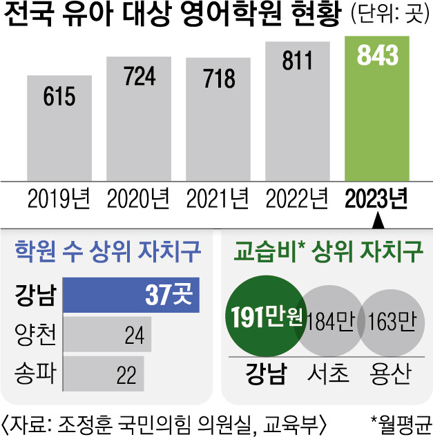 국민의힘 조정훈 국회의원이 교육부로부터 제출받은 최근 5년간 시도교육청별 유아대상 영어학원 현황을 보면 서울이 227개에서 258개, 부산이 41개에서 69개, 대구는 19개에서 41개, 인천은 23개에서 41개, 경기는 147개에서 230개로 늘었다. 2019년만 하더라도 유아대상 영어학원이 아예 없던 세종에도 벌써 10군데의 유아대상 영어학원이 생겼다. 줄어든 곳은 강원도 뿐이었다.(13개→12개)