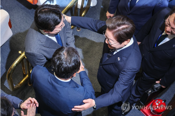 | ▲ 이재명 대통령이 26일 서울 여의도 국회 본회의장에서 추가경정예산안 시정연설을 마친 뒤 당대표 출사표를 던진 정청래, 박찬대 의원을 격려하고 있다. (사진=연합뉴스) |