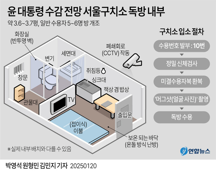 윤석열은 구속 후 ‘머그샷’ 촬영, 신체검사 등 정식 수용 절차를 거쳤고, 특별한 저항 없이 절차에 따라 잘 협조했다고 신 본부장은 전했다. 교정당국은 서울구치소가 현직 대통령 신분인 윤석열 경호를 위해 전담 교도관을 배치했다고 밝혔다.