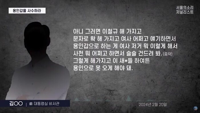 김 전 비서관은 "국민의힘 지지자가 썼다는 글로 이 기자도 이런 식으로 김건희 여사의 개인 문제를 자극해 이 공간 위원을 압박하라 지시한 것 "이라고 장인수 기자는 보도했다.