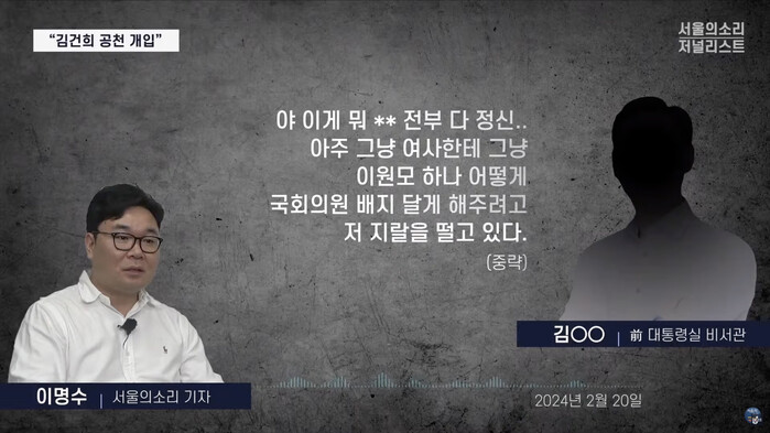 이명수 기자가 "김건희 여사가 공천에 개입, 많이 하고 있네요"라고 하자 김 전 비서관은 "(이원모) 마누라, 그 뭐 윤이 중매 섰던 그 인간 아니야? 윤이 중매 섰잖아. 야, 그것도 모르냐?"라고 놀리듯 면박을 주는 내용도 녹취를 통해 공개됐다.
