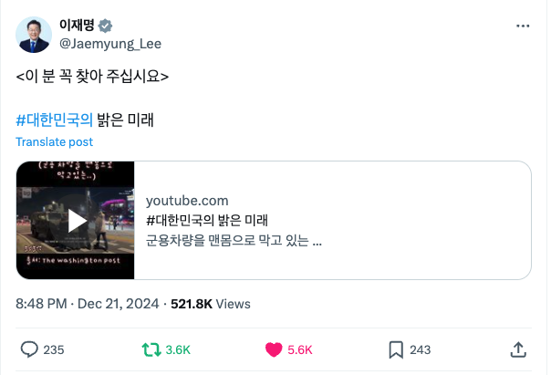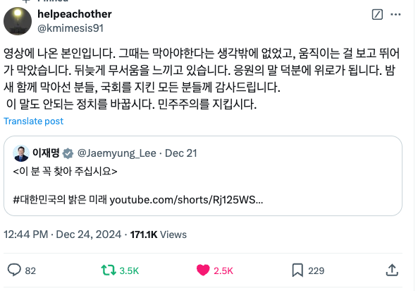 12·3 비상계엄 당시 국회 통제 작전에 투입된 군용차량을 막아 선 ‘맨몸 의인’ 남성이 “이 분을 꼭 찾아달라”는 이재명 더불어민주당 대표의 멘션에 응답했다.