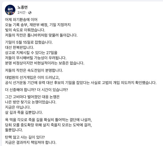 - 노종면 "공식 선거운동 기간에 유력 대선 후보의 기일...고법의 대선 개입 의도 확인"