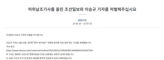 하지만 이번 소식을 접한 네티즌들은 기사를 작성한 이승규 기자가 직접 올린 것으로 추정하며 <허위날조 기사를 올린 조선일보와 이승규 기자를 처벌해 주십시요>라는 국민청원을 올려 조선일보와 이승규 기자의 조국 전 장관 일가에 대한 사죄와 응분의 배상에 관련한 청원동의를 받고 있다.