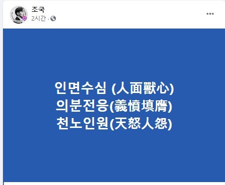 | ▲조국 전 장관이 23일 오전 조선일보에서 작성된 문제의 일러스트 논란에 대해 자신의 심경을 사자성어로 남겼다. © 조국 전 장관 페이스북 갈무리 |