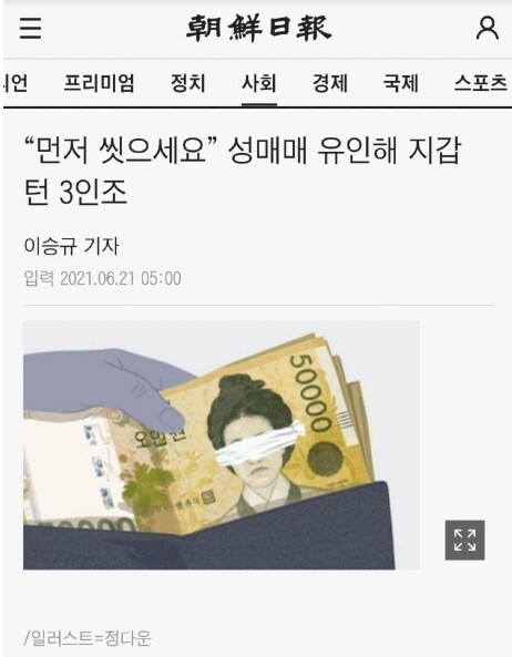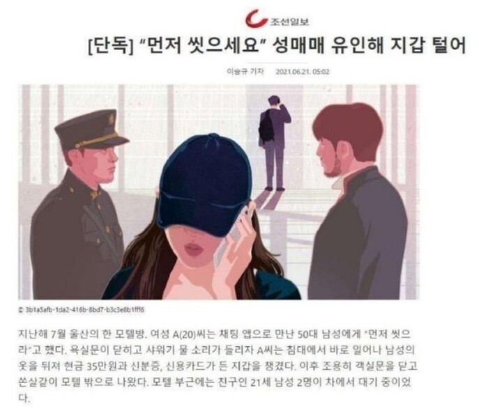 조선일보에 21일 올라온 <[단독] “먼저 씻으세요” 성매매 유인해 지갑 털어>란 기사는 20대 여성이 성매매를 목적으로 접근한 50대 남성을 채팅 앱으로 유인해 성매매 직전 남성의 금품을 챙기는 수법의 범죄에 관련한 내용이었다.