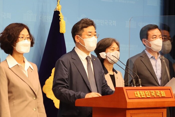 | ▲박찬대 민주당 의원 등 국회 교육위 위원들이 7일 국회 소통관에서 김건희 씨의 허위 경력 기재를 비판하며 본인의 직접 해명을 촉구하는 공동기자회견을 열었다. 박찬대 의원 페이스북 |
