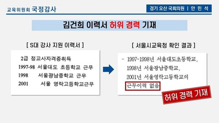 그러나, 서울시교육청과 국민대에 확인한 결과, 김건희 씨가 적어낸 이력은 대부분 허위였으며 이들 학교에서 근무라고 할 만한 직책을 맡지 않았다.
