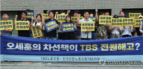 | ▲ TBS 노동조합원들이 서울 중구 성공회빌딩 앞에서 오세훈 서울시장을 규탄하는 구호를 외치고 있다. 2024.8.8 (사진=연합뉴스) |
