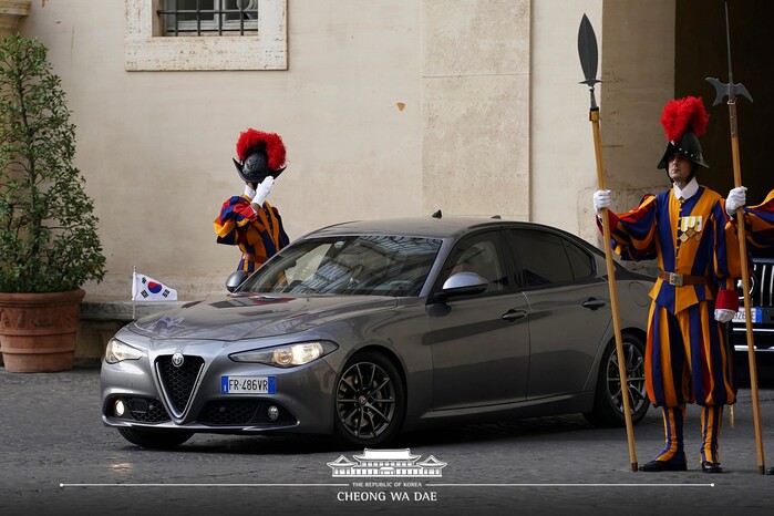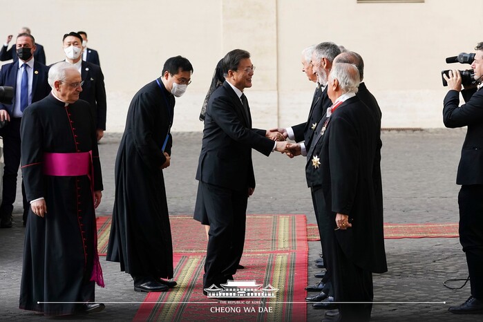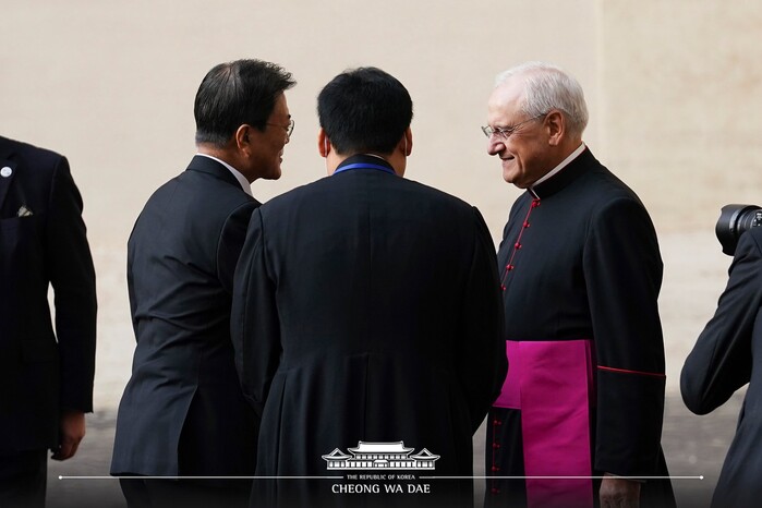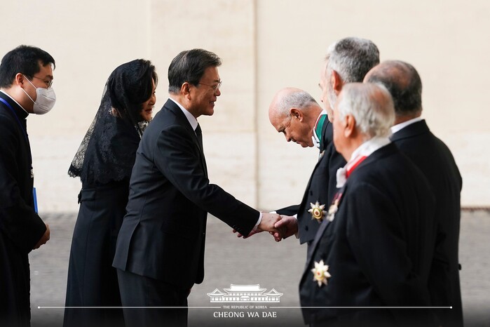 문재인 대통령은 29일 오전(현시시각) 바티칸에 도착해 교황청을 공식 방문했다. 현재 문 대통령은 프란치스코 교황을 만나 단독 면담을 진행했다. 교황청에서는 레오나르도 사피엔자 몬시뇰 교황청 궁내원 의전 담당과 교황청 의장단이 문 대통령을 맞았다. 문 대통령은 차례로 인사와 악수를 나눈 뒤 교황궁으로 입장했다.